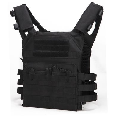 Taktická vesta v čiernej farbe, MOLLE systém, univerzálna veľkosť, predné puzdro na 2 zásobníky, hrudník a chrbát s nosičmi nepriestrelných plátov
